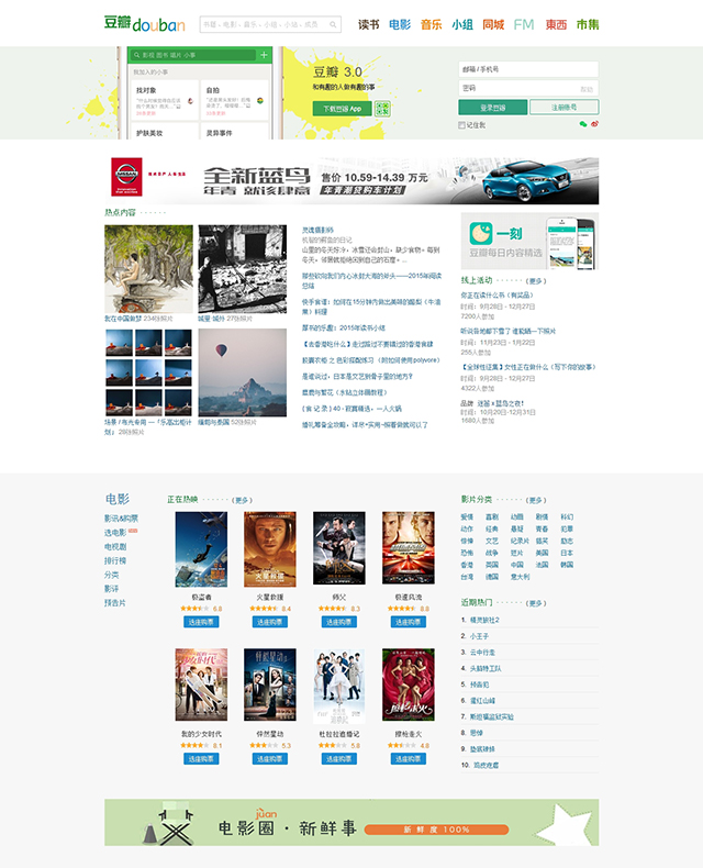 豆瓣是國內一個非常出名的社區(qū),在這個文藝青年聚集的平臺上,我們從網頁設計就可以感受到一陣文藝清新風撲面而來。