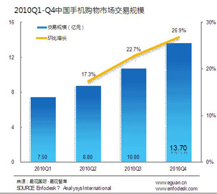 根據(jù)易觀智庫Enfodesk發(fā)布的《2010年第4季度中國手機購物市場季度監(jiān)測》數(shù)據(jù)顯示,2010年中國手機購物市場交易規(guī)模達到41億元。其中虛擬類商品交易規(guī)模達12億,占總體交易規(guī)模比例為33.1%。
