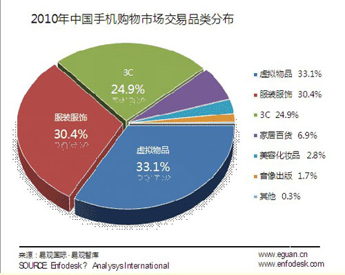 數(shù)據(jù)顯示2010年虛擬交易規(guī)模占比仍然居于交易品類的首位。虛擬交易包括手機充值、網(wǎng)游充值、網(wǎng)購彩票以及機票等業(yè)務(wù)。手機購物的發(fā)展周期特征呈現(xiàn)于PC端電子商務(wù)類似特征,不同的是手機端消費與服務(wù)的便捷性強相關(guān)。易觀研究認為,高標準化、便捷性消費是首先爆發(fā)的類目,如手機充值、彩票。未來此類交易仍然會是手機購物的主流。