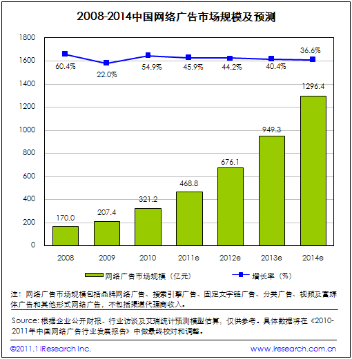 2011年沒有重大熱點(diǎn)事件,市場(chǎng)的增長(zhǎng)將比較平穩(wěn),但新的媒體形式的發(fā)展將會(huì)繼續(xù)推動(dòng)中國網(wǎng)絡(luò)廣告市場(chǎng)增長(zhǎng),艾瑞預(yù)計(jì)增速達(dá)到45.9%,市場(chǎng)規(guī)模468.8億元。