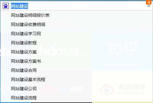 二、根據(jù)百度相關(guān)關(guān)鍵詞這個(gè)功能進(jìn)行網(wǎng)站主題關(guān)鍵詞定位,比如網(wǎng)站主題是關(guān)于網(wǎng)站建設(shè)的,通過百度搜索網(wǎng)站建設(shè),在搜索的時(shí)候下拉框里面就會(huì)出現(xiàn)如下圖所示: